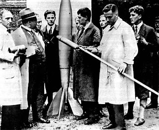 El hombre que está a la derecha del cohete es Hermann Oberth. Los dos de blanco son Rudolf Nebel y Klaus Riedel. El del sombrero Franz Ritter. El joven de la derecha es Wernher von Braun, por entonces un simple ayudante.